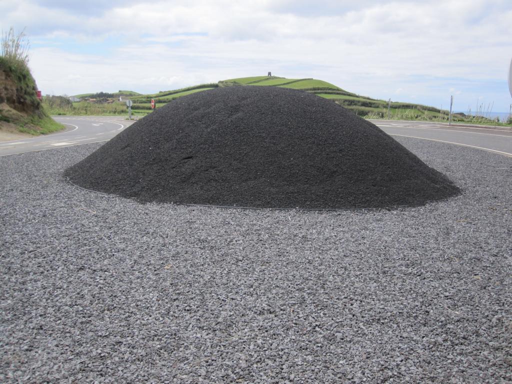 Zwischen Várzea und Mosteiros im Westen von São Miguel liegt der sehr schöne Aussichtspunkt von Escalvado. An der Hauptstraße ist dort ein Kreisel, den man nun neu gestaltet hat. Beim ersten Vorbeifahren dachte ich: Dies ist eine in länglicher Kegelform hingekippter LKW-Ladung von festem Basaltbitumen. Ich erachtete dies als sehr originell und war gespannt, wie er sich entwickeln würde: Wie auch bei den vielen natürlichen Basaltkegeln dieser Gegend würde der Wind ihn allmählich mit Staub und Erde bedecken. An ihm könnte man also im Laufe der Zeit die Entstehung einer Mutterbodenschicht und der Vegetation beobachten.