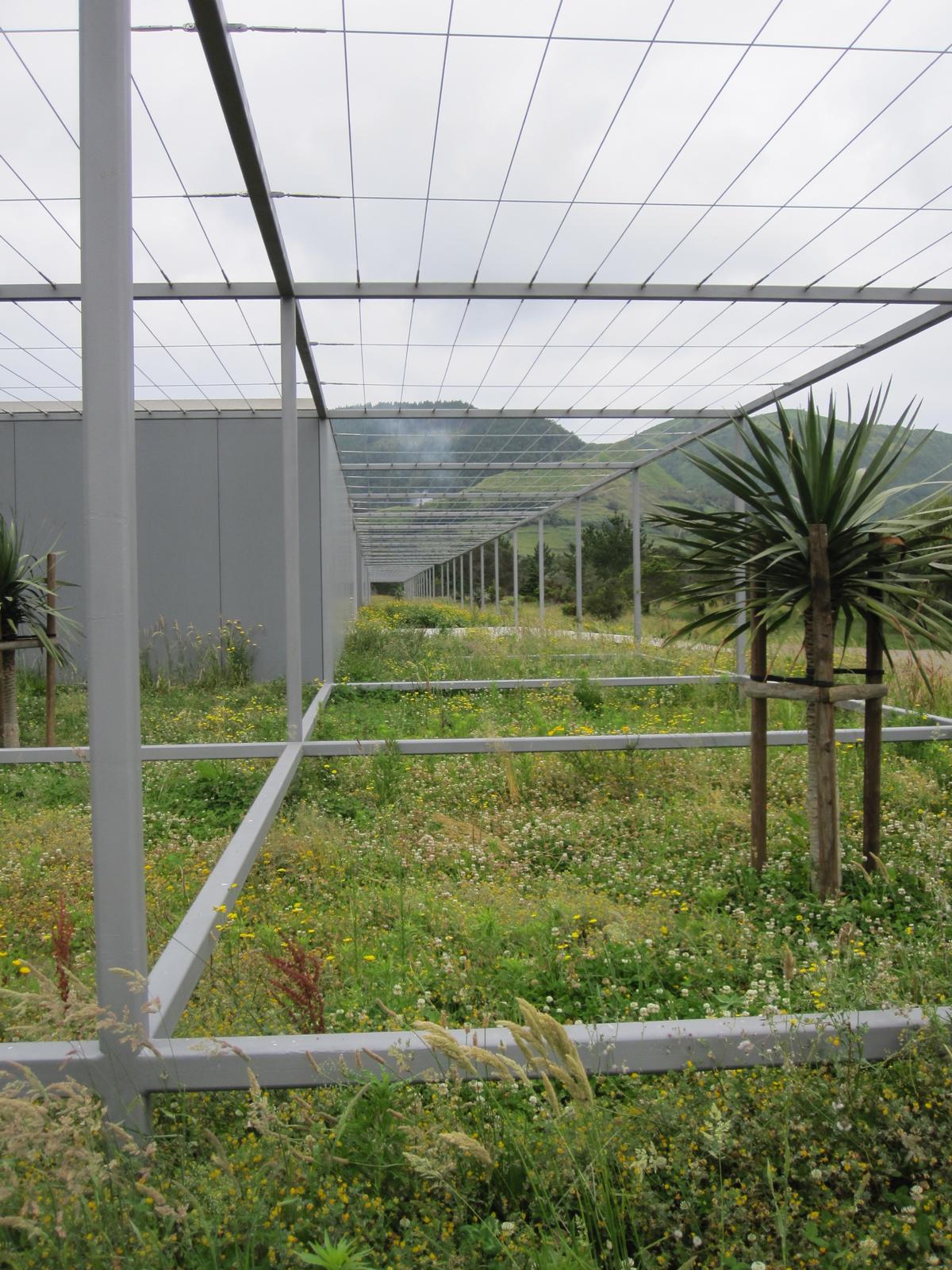 Heute, am 13. Juli, an einem schönen Samstagnachmittag, war ich mal wieder dort. Alle Container sind öde und verschlossen. Kein Mensch weit und breit. Das Unkraut wuchert in den Stahlgestellflächen. Wie will man darin mähen! Vereinzelt hat man junge Drachenbäume gepflanzt. Die durchstoßen in wenigen Jahren die darüber gespannten Drähte. An einigen Pfosten hat man Maracujá-Pflänzchen eingesetzt. Teilweise sind sie am Vertrocknen. Diese Pflanzen werden nur wenige Jahre alt und sind kaum dazu geeignet, die Drähte zu überspannen. Allenfalls können sich die Besucher an den Früchten erfreuen. Vergeblich schaute ich nach einem barrierefreien Zugang an der Straße, nach Geländern auf den Terrassen, nach einer Außenbeleuchtung. Aber dafür hatte man ja einen preisgekrönten Architekten engagiert.