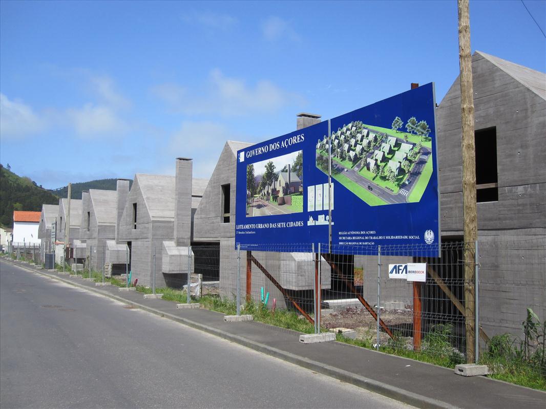 Der berühmte Architekt Souto Moura, der mit seinen unnützen und leerstehenden Containern das Seeufer von Sete Cidades verschandelt hat, hat auch diese Häuschen erfunden bzw. verbrochen. Seit einem Jahr stehen sie so im Rohbau und niemand will sie haben. Die Bevölkerung macht sich darüber lustig und sagt, es seien Confuôes, jene dreieckigen Gestelle, auf denen Mais getrocknet wird. Den jungen Familien sind sie zu teuer, zu klein und zu hässlich, obwohl die Regierung behauptet, sie seien "von höchster Qualität". Wahrscheinlich ist damit die Betonqualität gemeint.