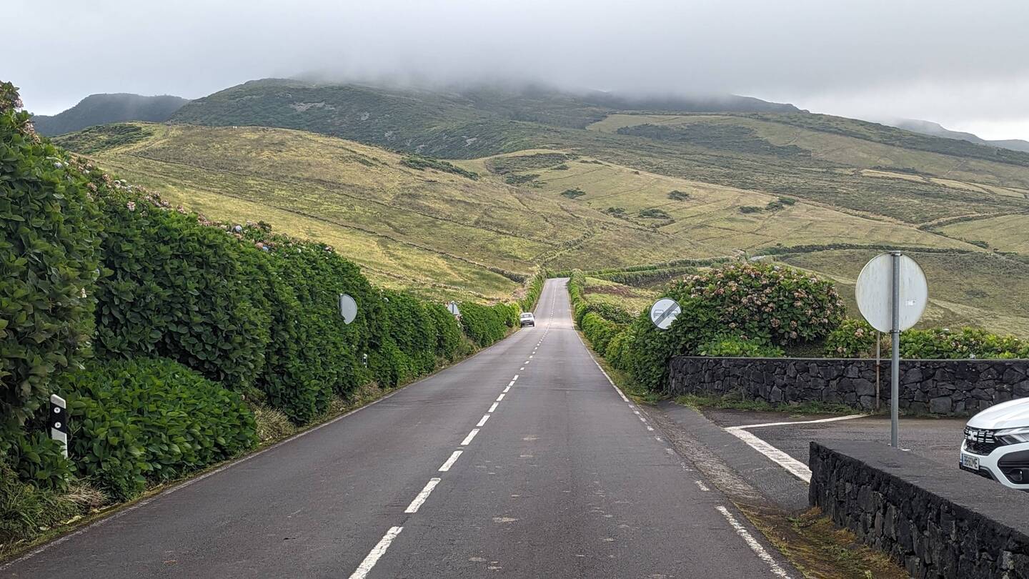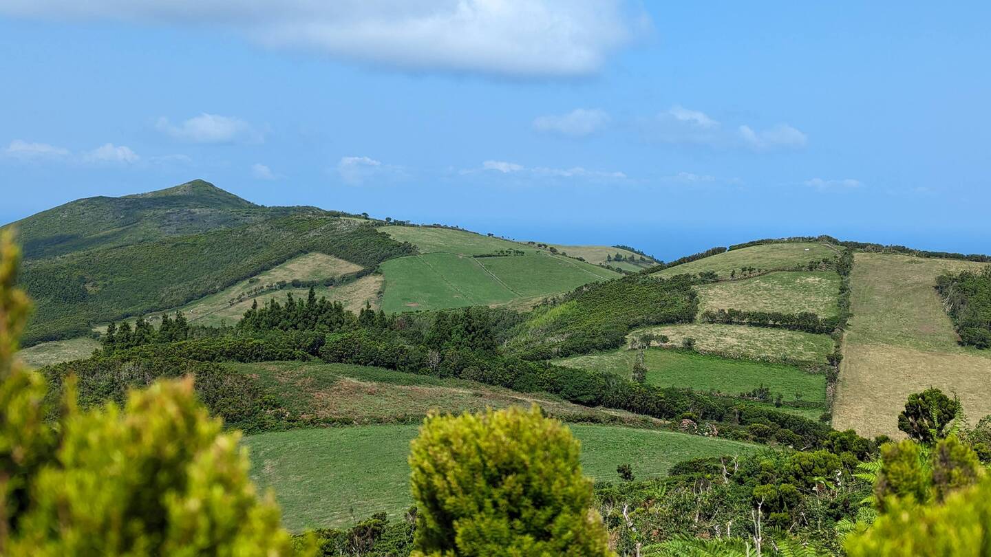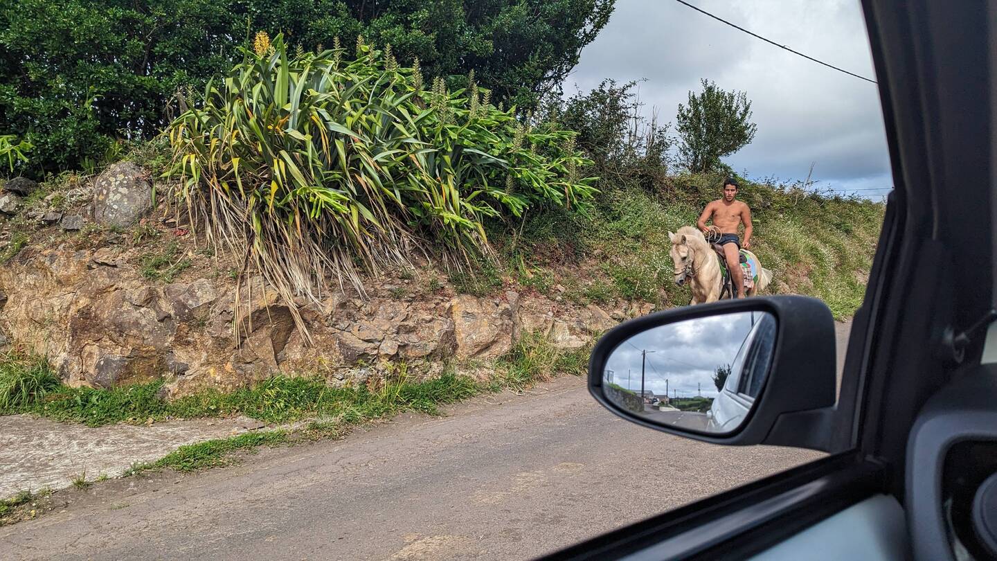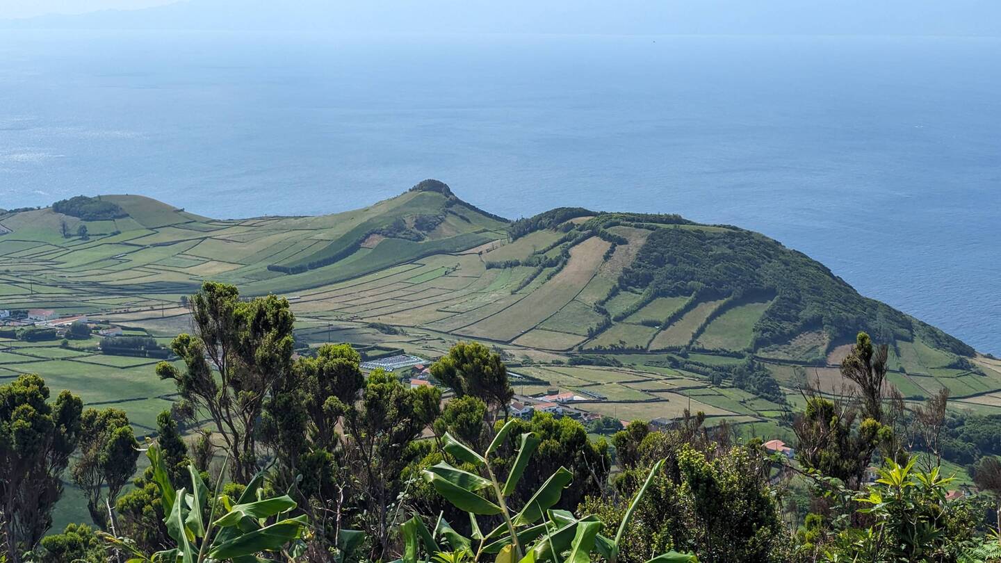 Heute wollen wir nur etwas Kleines unternehmen. Eine Wanderung im Osten der Insel soll es sein, beschliessen wir nach dem Frühstück. Doch die Fahrt durch die wunderschöne Landschaft zieht sich. Laut Google sollten die 34 Kilometer in 40 Minuten zu schaffen sein. Doch unser kleines Auto ist so schwach, dass wir auf dem ständigen Auf und Ab und Links und Rechts der hiesigen Strassen nur selten die Höchstgeschwindigkeit erreichen. Hinzu kommt, dass immer wieder Kühe von einer Weide zur nächsten ziehen und wir dann nur im Kuhtempo vorankommen. Doch verglichen mit den Strapazen, die diese Strecke früher für die Bewohner bedeutete, ist es heute ein Katzensprung. Denn lange Zeit trennte die auf 900m liegende Hochebene Serra do Topo, die wir gerade durchquert haben, die Menschen im Osten vom Rest der Insel, und so war es für viele einfacher, mit dem Boot auf die 170 Kilometer entfernte Insel Terceira zu fahren, als den Weg über die Hochebene zu nehmen. Auch heute noch liegt Topo, der östlichste Ort hier, ziemlich abgelegen und wer nach Calheta oder Velas will, muss wie wir erst einmal eine lange Autofahrt über die hügelige, nur von weidenden Rindern bevölkerte Hochebene in Kauf nehmen.
