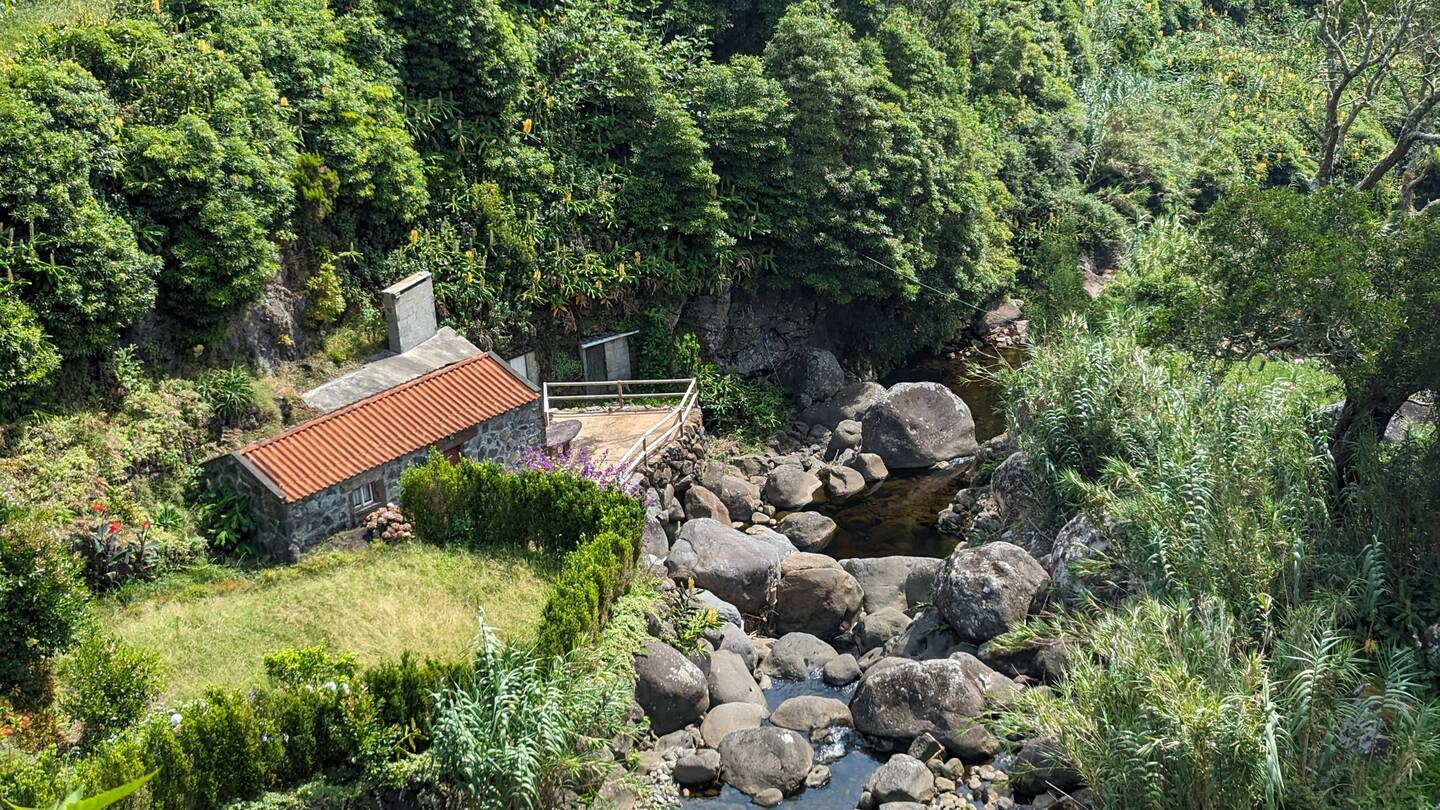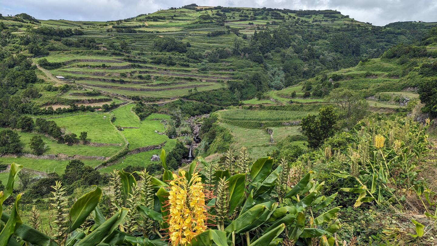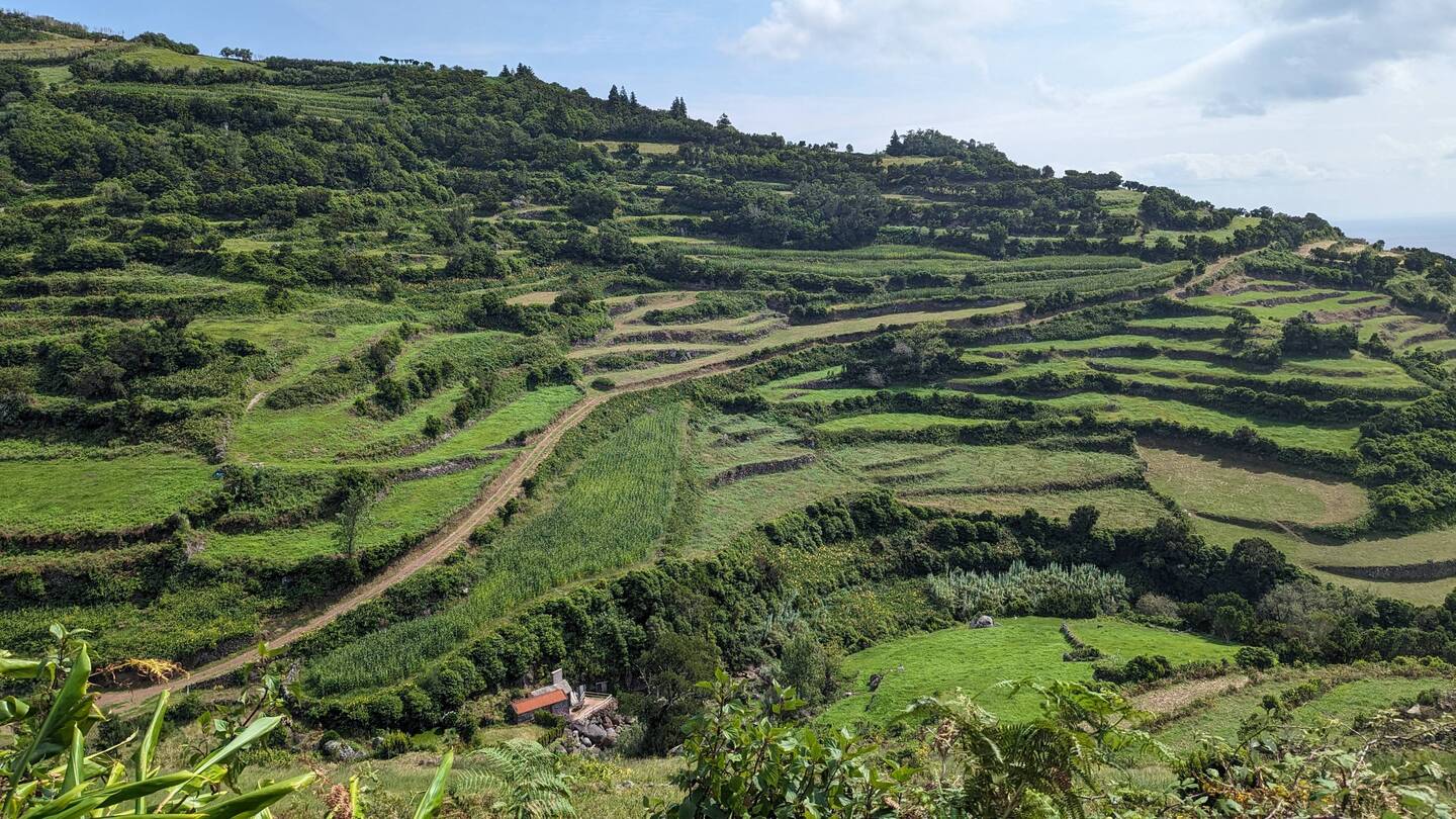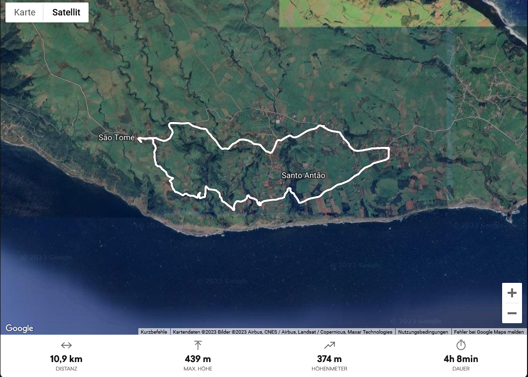 Die Wanderung ist für hiesige Verhältnisse einfach. Zwar geht es, wie wohl auf allen Wegen auf dieser Insel, ständig bergauf und bergab, aber auf guten Feldwegen. Wir genießen die Aussicht, sehen nur sattes Grün um uns herum und in der Ferne das Meer. Allerdings brauchen wir für den Hinweg fast doppelt so lange wie unser Wanderführer (Rother) angibt und so beschliessen wir, den Rückweg teilweise auf der Hauptstrasse und auf einfacheren, aber vielleicht nicht ganz so eindrucksvollen Wegen zurückzulegen. Dabei kommen wir auch an der einzigen Café/Bar weit und breit, dem "Café e Mercearia Alves", vorbei und nutzen die Gelegenheit auf eine Kima (eine lokale, extrem leckere und ebenso süsse Maracuja-Limonade) und ein Eis am Stil einzukehren (Total 3.70€). Das ganze Lokal besteht aus einem gekachelten Raum mit einer Bar und 4 kleinen Tischen. An der Bar sitzen 4-5 Bauern/Arbeiter, die gerade ihre Pause machen. Ihre angeregte Diskussion lässt den gekachelten Raum so stark vibrieren, dass sich die Schwingungen sogar über den Boden auf meine Füsse und Beine übertragen. Auch wenn es eigentlich das "echte Leben" ist, das man als Tourist sucht, ist es uns dann doch etwas zu echt und wir schauen, dass wir so schnell wie möglich austrinken, um wieder in die ländliche Ruhe zurückkehren zu können.