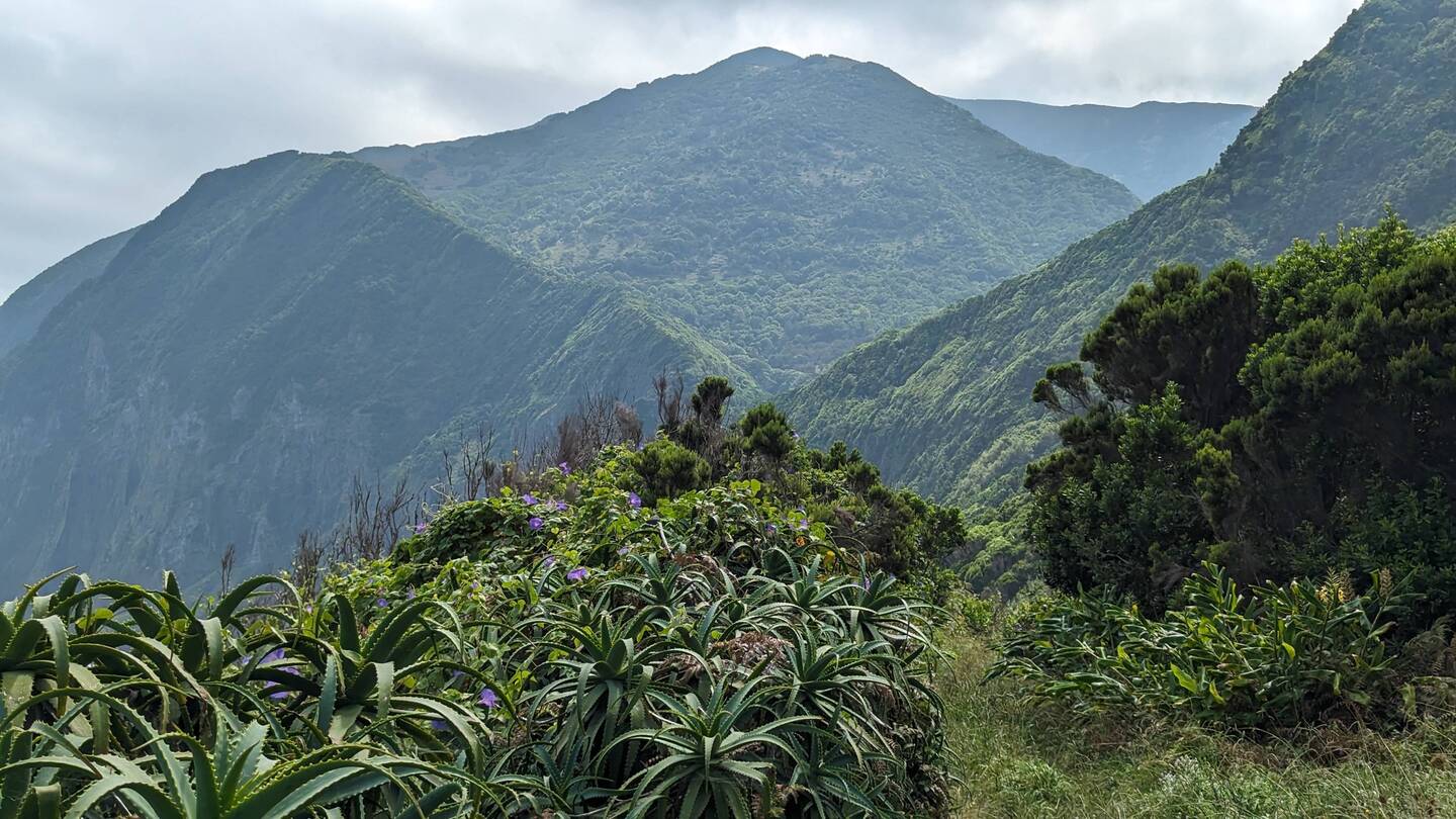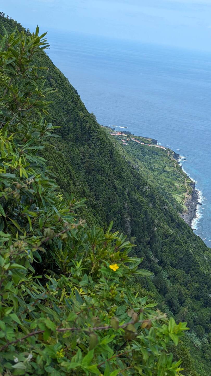 Unser zweiter Stopp ist Norte Pequeno und ja, das Dorf ist noch kleiner als Norte Grande und besteht eigentlich nur aus der Kirche und ein paar Häusern drum herum. Hier machen wir einen kleinen Teil einer Wanderung, die eigentlich hinunter zu einer autofreien Fajã und natürlich auch wieder hinauf führt. Wir verzichten auf diesen sehr anstrengenden Teil und begnügen uns mit einem Spaziergang in der Ebene bis zum Abstieg mit anschliessendem Rückweg.