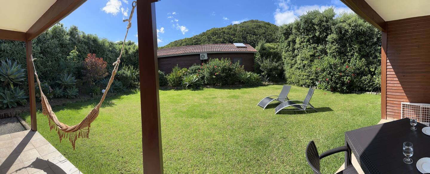 Sehr gesprächig, mit einem Laptop auf seinem Schreibtisch und einem Bildschirm in unsere Richtung, versorgt er uns mit vielen Informationen, zeigt uns Karten auf dem Bildschirm, zeigt uns auf den Karten, wo die guten Restaurants sind - es gibt nur wenige Restaurants auf der Insel, deshalb ist es unbedingt notwendig, einen Tisch zu reservieren, vor allem für das Abendessen -. Er zeigt uns einen QR-Code auf dem Bildschirm, den wir einscannen können und der uns zu Karten im PDF-Format führt. Das ist schon erstaunlich auf dieser Insel, die in vielerlei Hinsicht ein paar Jahrzehnte zurückzuliegen scheint. Dann zeigt er uns unsere Unterkunft für die kommende Woche. Der Bungalow übertrifft unsere Erwartungen, vor allem der große Garten, 100 Quadratmeter vor der überdachten Terrasse.