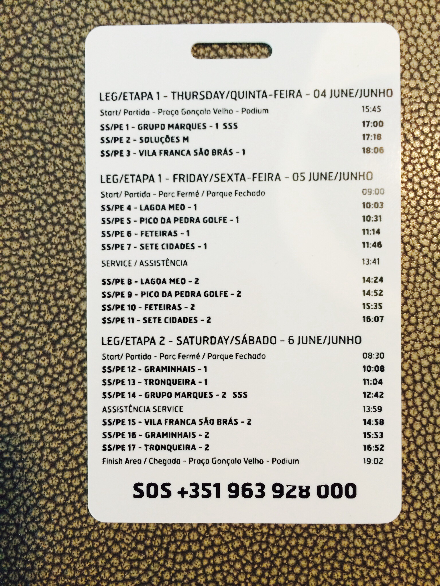 Auf dem Rallye Pass stehen hinten drauf die verschiedenen Stages mit den Anfangszeiten.