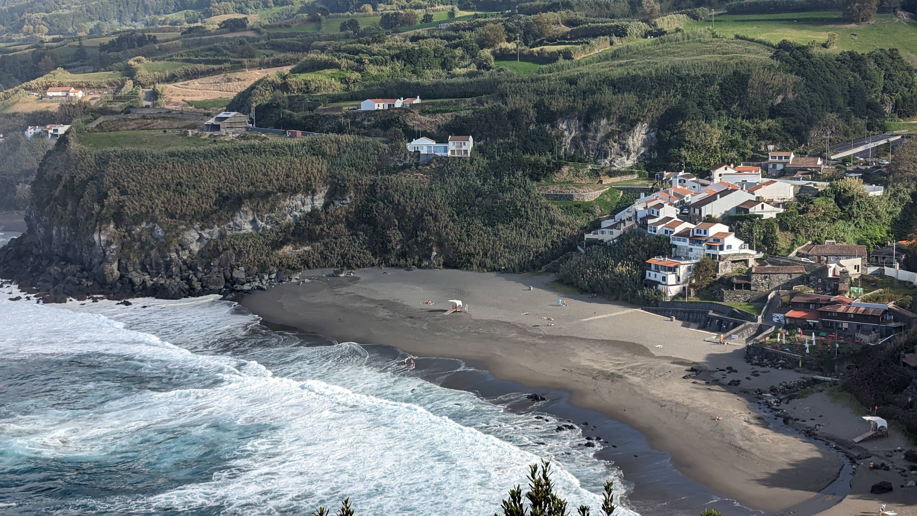 Am Abend fahren wir ins 15 Minuten entfernte Ribeira Grande, der zweitgrössten Stadt der Insel. Zuerst gehen wir zum Santa Barbara Strand, dem grössten der Insel, und lassen die Abendstimmung auf uns wirken. Danach essen wir in einem sehr typischen azorischen Fischrestaurant mit schönem gekacheltem Gastraum und auch das Essen schmeckt uns ausgezeichnet. Satt gehen wir zurück ins Haus für unsere letzte Nacht am Meer.