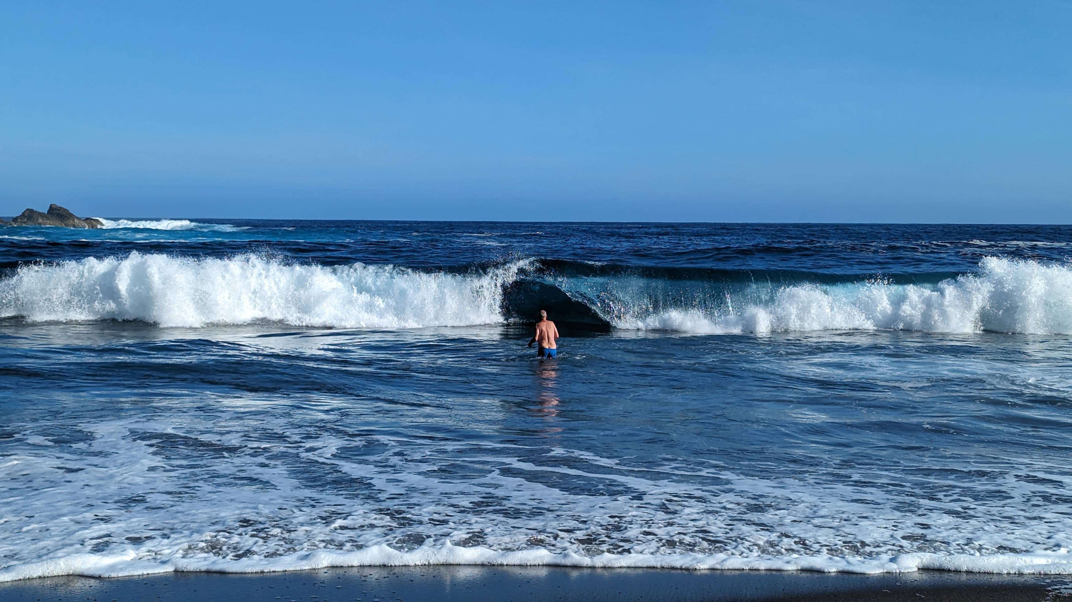 Heute ist Tag des Wassers! Gleich nach dem Frühstück, das wir heute zum ersten Mal draussen mit Blick auf den Strand geniessen können, da der sonst so starke Wind ausbleibt, geht es runter zum Meer. Die Wellen sind allerdings doch etwas anders als in den letzten Tagen, eher etwas kleiner aber dafür umso mächtiger irgendwie auch härter. Da um diese Zeit noch fast niemand am Strand ist und schon gar kein Rettungsschwimmer, spiele ich nur ein wenig mit den Wellen und gehe bald wieder an Land. Michel ist heute auch am Strand, da die Brandung von uns oben eher harmlos aussah. Nun am Strand jedoch entscheidet er sich vernünftigerweise nur bis zu den Knien im Wasser zu sein. Auch so ist die Wucht der ablaufenden Wellen stark genug, um ins Wanken zu geraten! Wir bleiben etwas mehr als eine Stunde unten am Strand, Wellen gucken - was gibt es Schöneres!