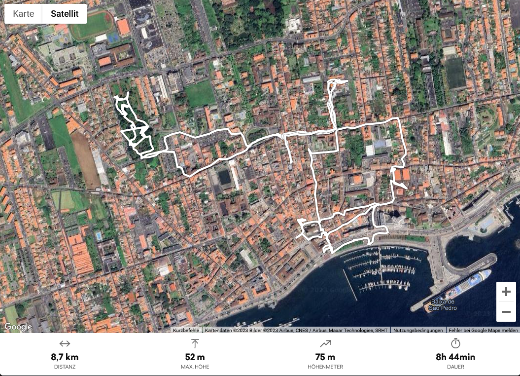 Der Himmel klart auf, je weiter wir in Richtung Ponta Delgada fahren. Wir kommen in einer sonnigen Stadt an. Unsere letzte Nacht auf den Azoren haben wir im Hotel Canadiano gebucht, das wir von unserem letzten Aufenthalt kennen. Es ist einfach, ohne Schnickschnack, liegt fast im Stadtzentrum, aber in einem ruhigen Innenhof und hat einen grossen Parkplatz. Wir werden diesen nur kurz nutzen, um unser Gepäck an der Rezeption abzugeben, da unser Zimmer erst in zwei Stunden fertig sein wird, und dann einen kleinen Spaziergang durch die Altstadt zu machen. Nach einem kleinen Imbiss kehren wir ins Hotel zurück, während Markus den Mietwagen bei der Autovermietung zwei Strassen weiter abgibt, richte ich mich im Zimmer ein. Da wir immer noch keine Lösung für die 2,10 € Busse gefunden haben, die wir vor zwei Tagen bekommen haben, erkundigt sich Markus beim Autoverleiher nach dem weiteren Vorgehen. Zum Glück ist das einzige Parkhaus auf der Insel, wo die Zahlung der Busse möglich ist, nur 500 Meter entfernt. Wir haben im Vorfeld viel Zeit mit dieser Frage verbracht und sind umso erleichterter, dass sie nun erledigt ist.
