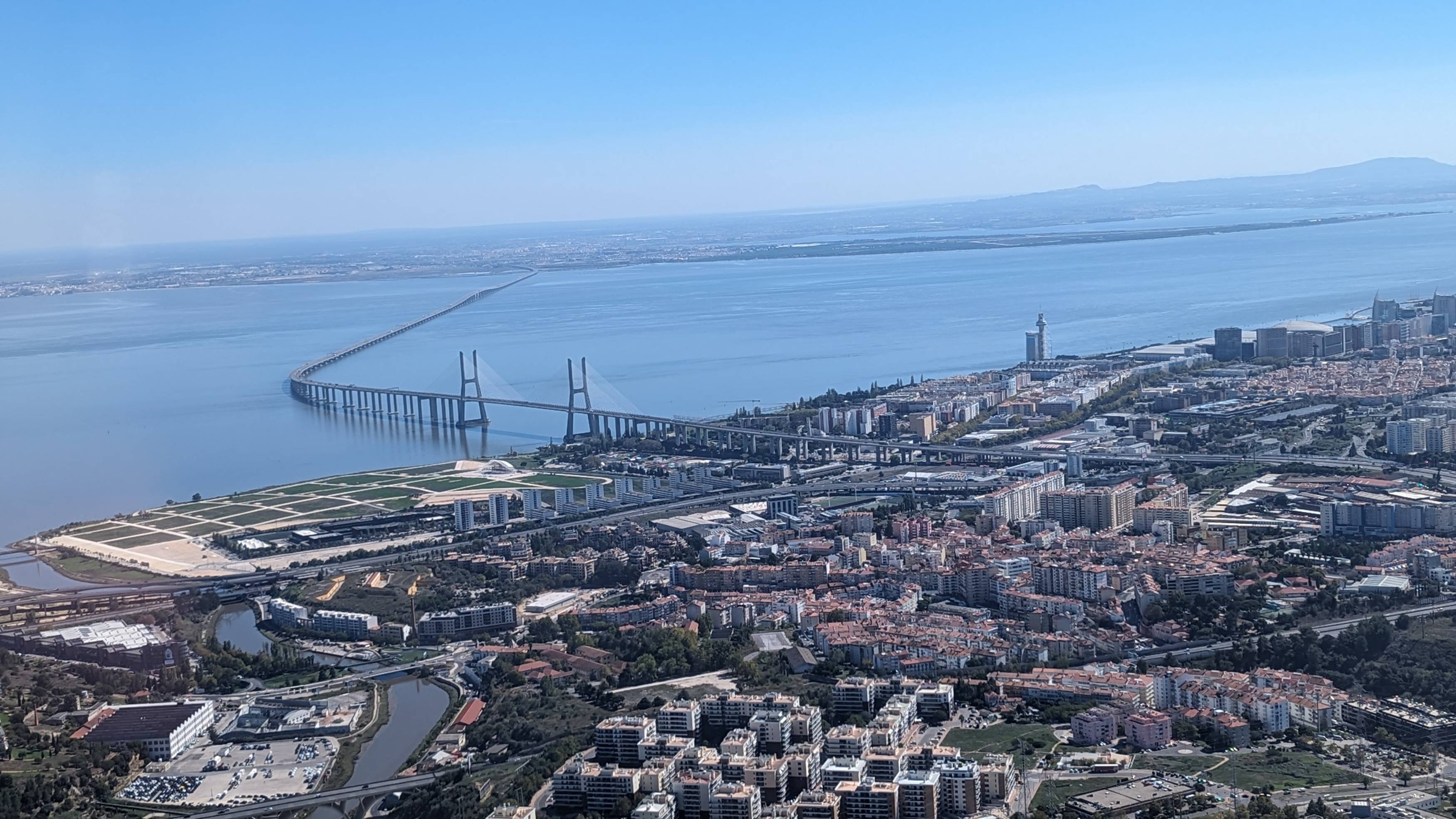 Blick auf den Park und die Vasco-da-Gama-Brücke vom Flugzeug aus